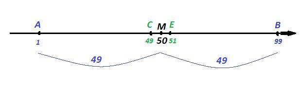Наиболее удалённые точки А(1) и В(99) - на 49 единиц.