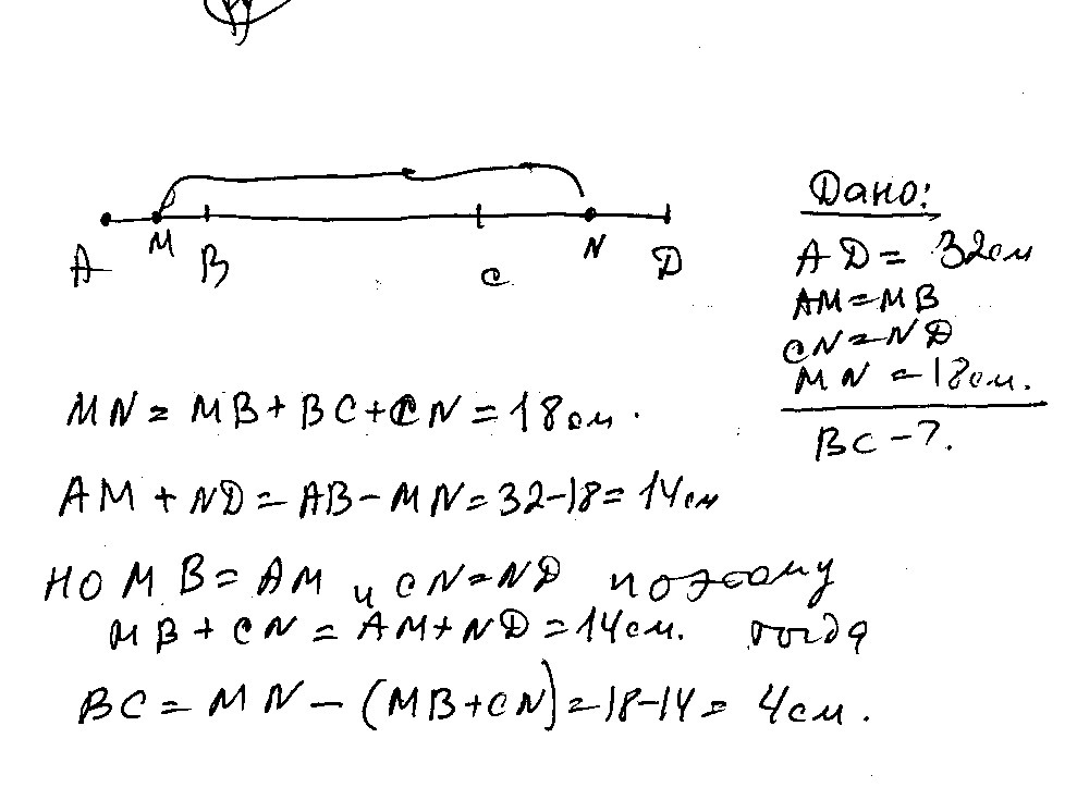 Отрезок, длина которого равна 32 см, разделив на три неравных отрезка. Расстояние между серединами крайних отрезков равна 18 см. Найти длину среднего отрезка.