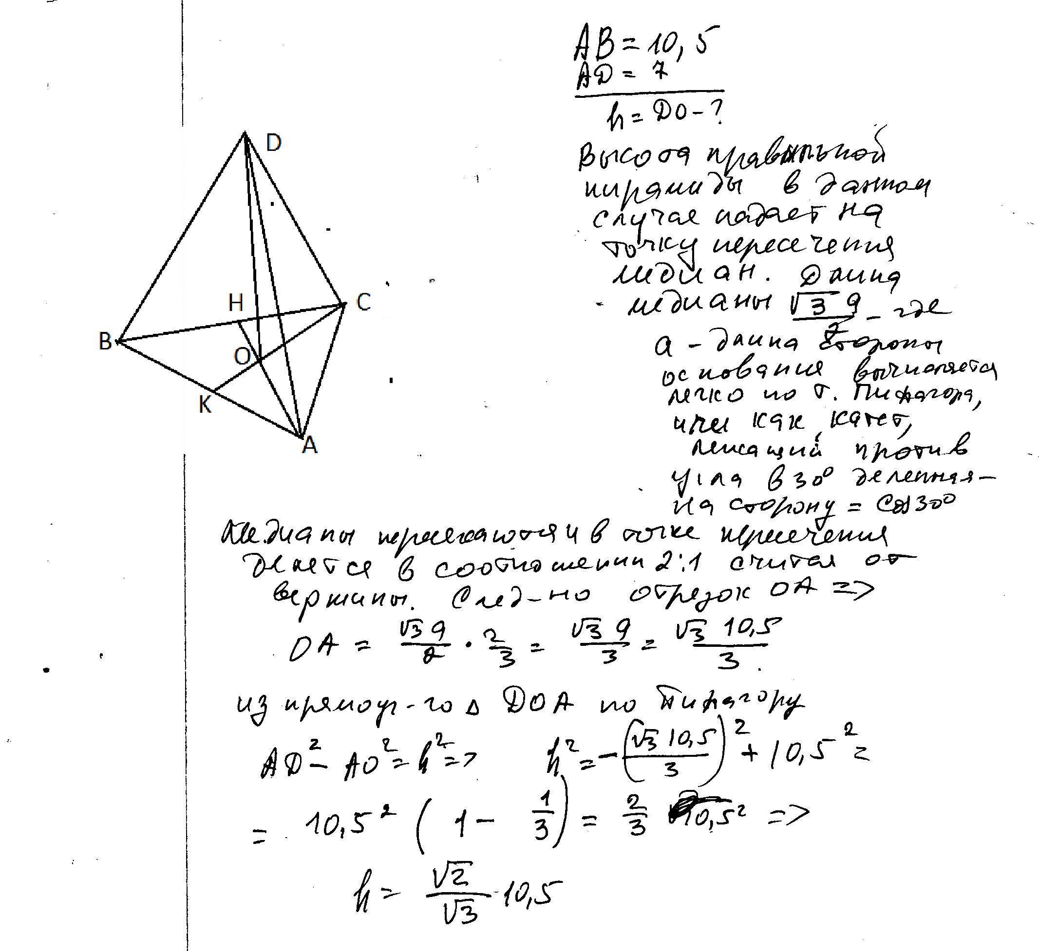 В правильной треугольной пирамиде боковое ребро равно 7 а сторона основания равна 10,5 найдите высоту пирамиды.