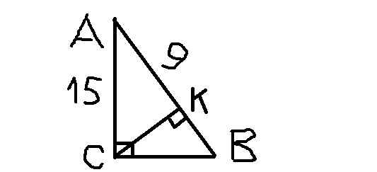 Проведем высоту из угла С прямоугольного треугольника ABC на гипотенузу AC. Из условия задачи ясно, что AC=15 см, CK=9 см. Заметим, что треугольники ABC и ACK подобны по двум углам. У треугольника ABC - угол С прямой, у треугольника ACK - угол К прямой. Угол А у этих треугольников общий. Выполняется признак подобия по 3-м углам. Узнаем коэффициент подобия этих треугольников. К углу А прилежащим катетом в треугольнике АВС будет сторона АС, а в треугольнике АСК, прилежащей к углу А будет сторона АК. Значит коэффициентом подобия этих треугольников будет отношение сторон АС и АК.