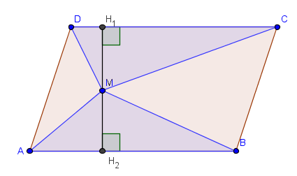 Доказательство очевидно - площадь параллелограмма = AB*(MH1+MH2), сумма площадей двух треугольников = 0.5AB*MH2+0.5BC*MH1=0.5(AB*MH1+AB*MH2)=0.5AB(MH1+MH2)