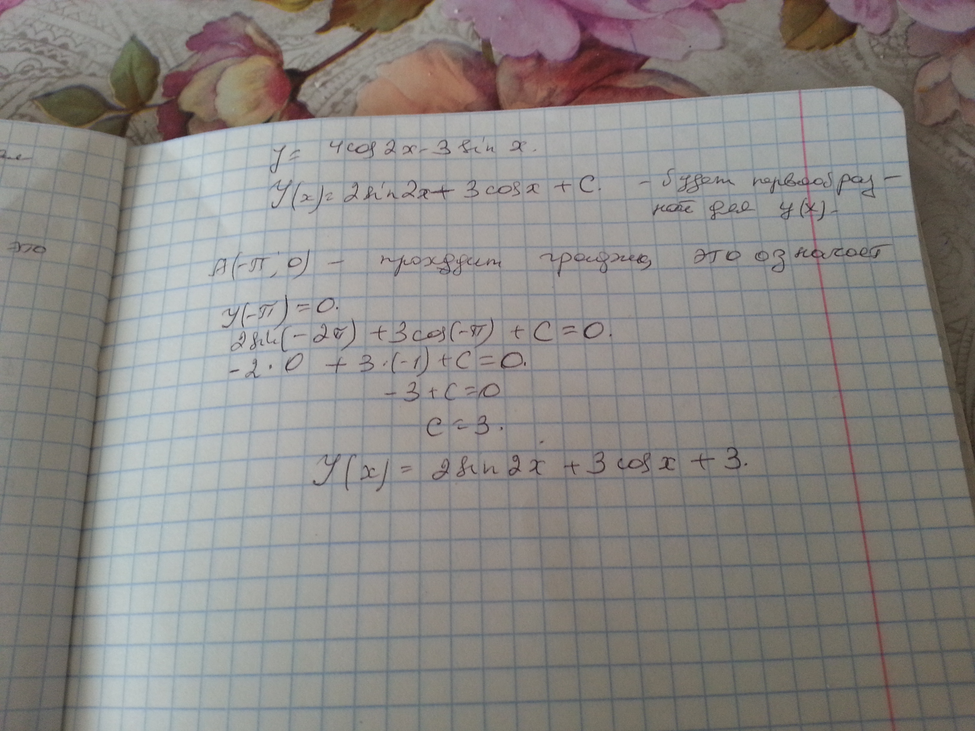 для данной функции у=4cos2x-3sinx найдите ту первообразную график которой проходит через данную точку А( -п;0)