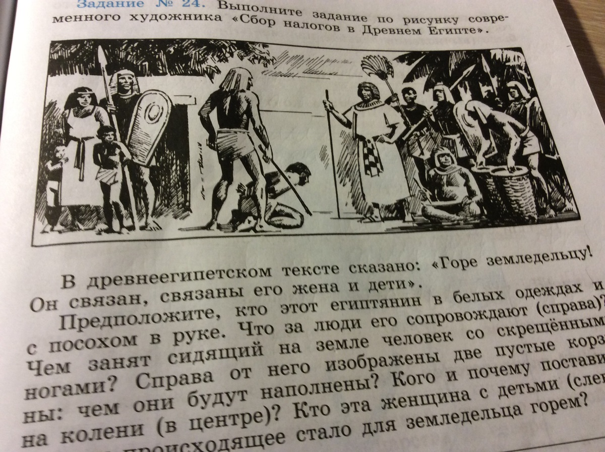 В древнеегипетско тексте сказано горе земледельцу ., он связан связаны его жена и дети !!! Предположите кто этот египтянин в белой одежде и с посохом в руке ? Что за люди его соправождают ? Чем занят сидящий человек на земле со скрещенными ногами , справа две корзины чем они будут наполнены ? Кого и почему поставили на колени в центре ? Кто эта женщина с детьми ? Почему происходящее стало для земледельца горем ?
