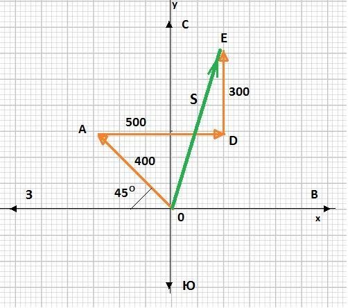 Туристы прошли сначала 400м на северо-запад, затем 500м на восток и ещё 300м на север.найти модуль перемещения и направление перемеремещения