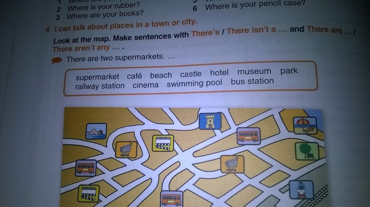 There are three bus stations. There are two cinemas. There is swimming pool. There is a beach. There is a park.