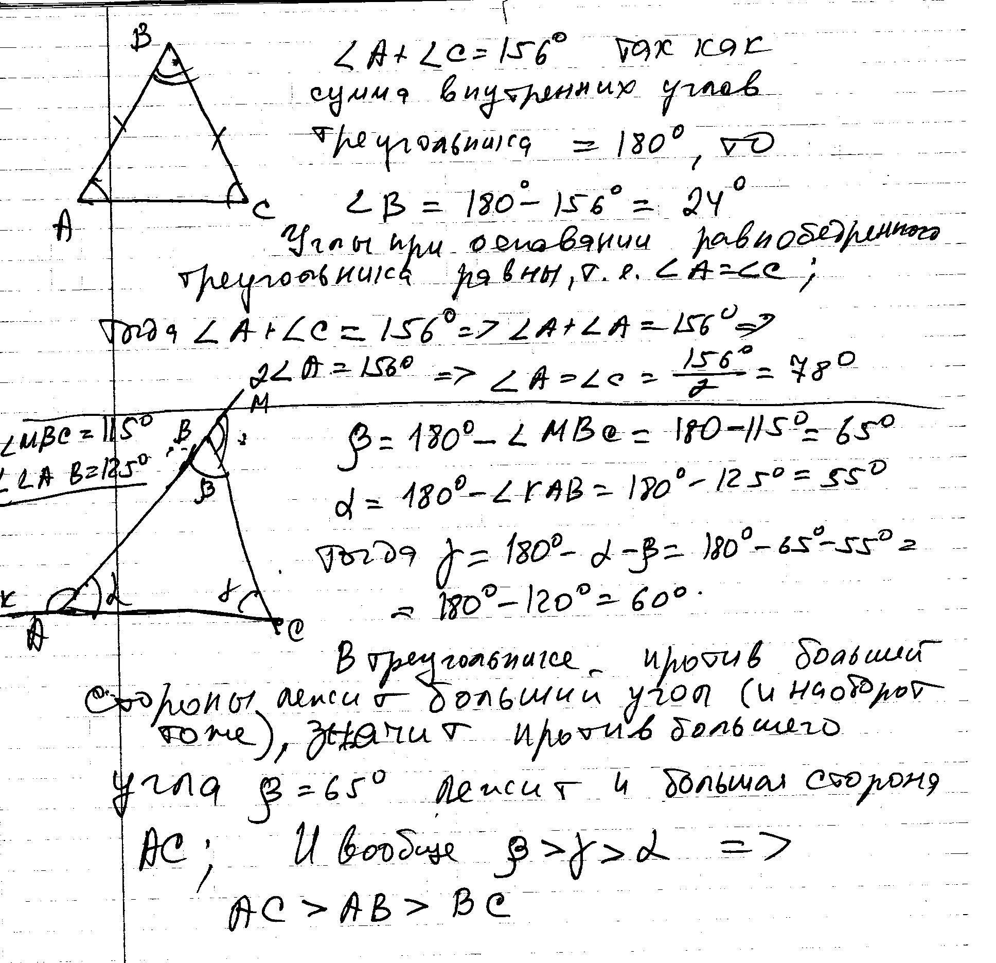 1. В равнобедренном треугольнике с основанием АС. уголА +уголС=156градусов.Найти углы треугольника.