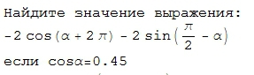 cos alpha =0,45\\-2cos( alpha +2pi )-2sin(frac{pi}{2}- alpha )=-2cos alpha -2cos alpha =-4cos alpha =\\=-4cdot 0,45=-1,8
