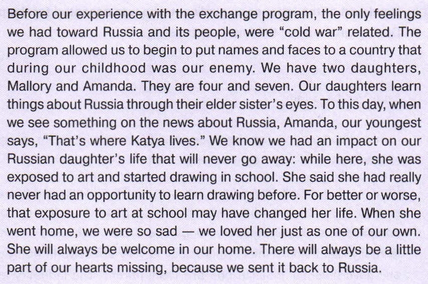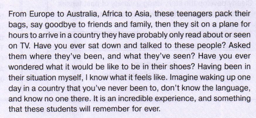 От Европы до Австралии, от Африки до Азии, эти подростки пакуют свои сумки, прощаются друзьями и семьёй, затем они садятся на самолёт, чтобы несколько часов добираться до страны, о которой они, возможно, только читали или которую видели по телевизору. Вы когда-нибудь садились и разговаривали с этими людьми? Спрашивали их, где они побывали и что они увидели? Вы когда-нибудь интересовались, какого это - оказаться на их месте? Сам оказавшись в их ситуации, я знаю, какого это. Представьте пробуждение в один день в стране, в которой вы никогда не были, не знаете языка и не знаете никого отсюда. Это невероятный опыт, и нечто, что эти студенты запомнят на всю жизнь.