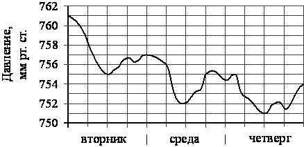 На рисунке изображён график изменения атмосферного давления в некотором городе за три дня. По горизонтали указаны дни недели, по вертикали — значения атмосферного давления в миллиметрах ртутного столба. Укажите наименьшее значение атмосферного давления в четверг (в мм рт. ст.).
