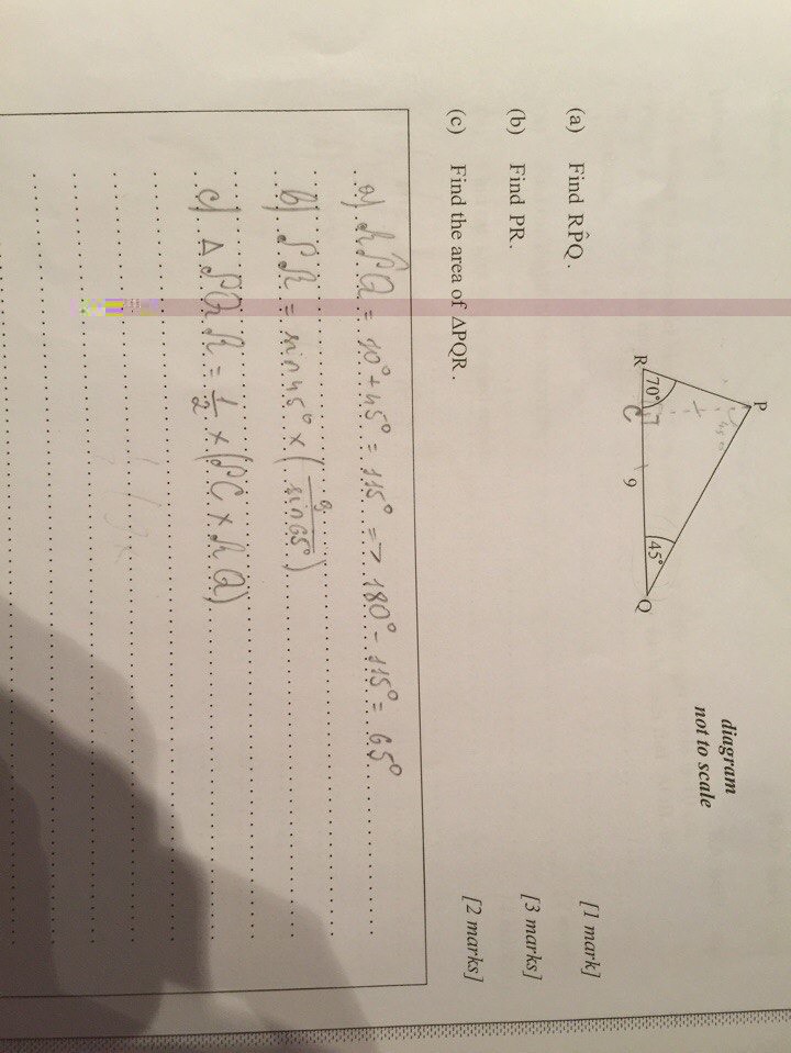 RP=RQ*sin45°/sin65°. RP=9*(√2/2)/sin65°