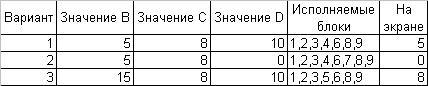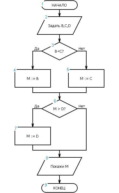 № 3 информатика 4 класс Бененсон: Составьте алгоритм, цель которого вывести на экран наименьшее из значений переменный В, С и D. Проверь правильность алгоритма для разных значений переменных. 1) В=5, С= 8, D=10; 2) В=5, С=8, D=0; 3) В=15; С= 8; D=10