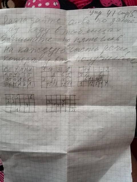 сначала посмотрите в каком ряду и в какой клетке цифра 1 ,а затем смотрите на первую таблицу на то же место.значит там буква,,с,, потом на 2 смотрите ,в первой таблице вместо 2 буква ую,,у,, и так дал.сущ.прилаг.нареч.глагол.