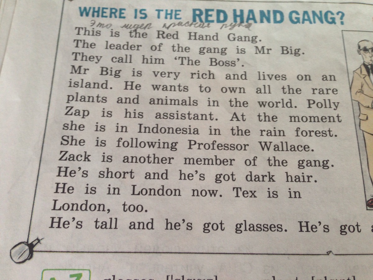 Це Червона Рука Банди . Лідер банди містер Велики . Вони називають його "Бос". Містер Великий дуже багатий і живе на острові. Він хоче, мати всі рідкісні рослини і тварин у світі. Поллі Зап є його помічником. В даний час вона знаходиться в Індонезії в тропічних лісах.Вона слідує за професором Уоллесом. .Зак є ще одним членом банди. Він короткий, і иав темне волосся. Він зарз в Лондоні , Teкс в Лондоні теж . Він високий, і він отримав окуляри........