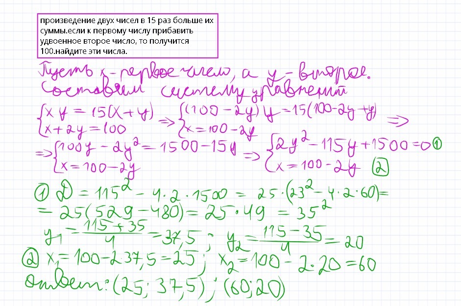 произведение двух чисел в 15 раз больше их суммы.если к первому числу прибавить удвоенное второе число, то получится 100.найдите эти числа.