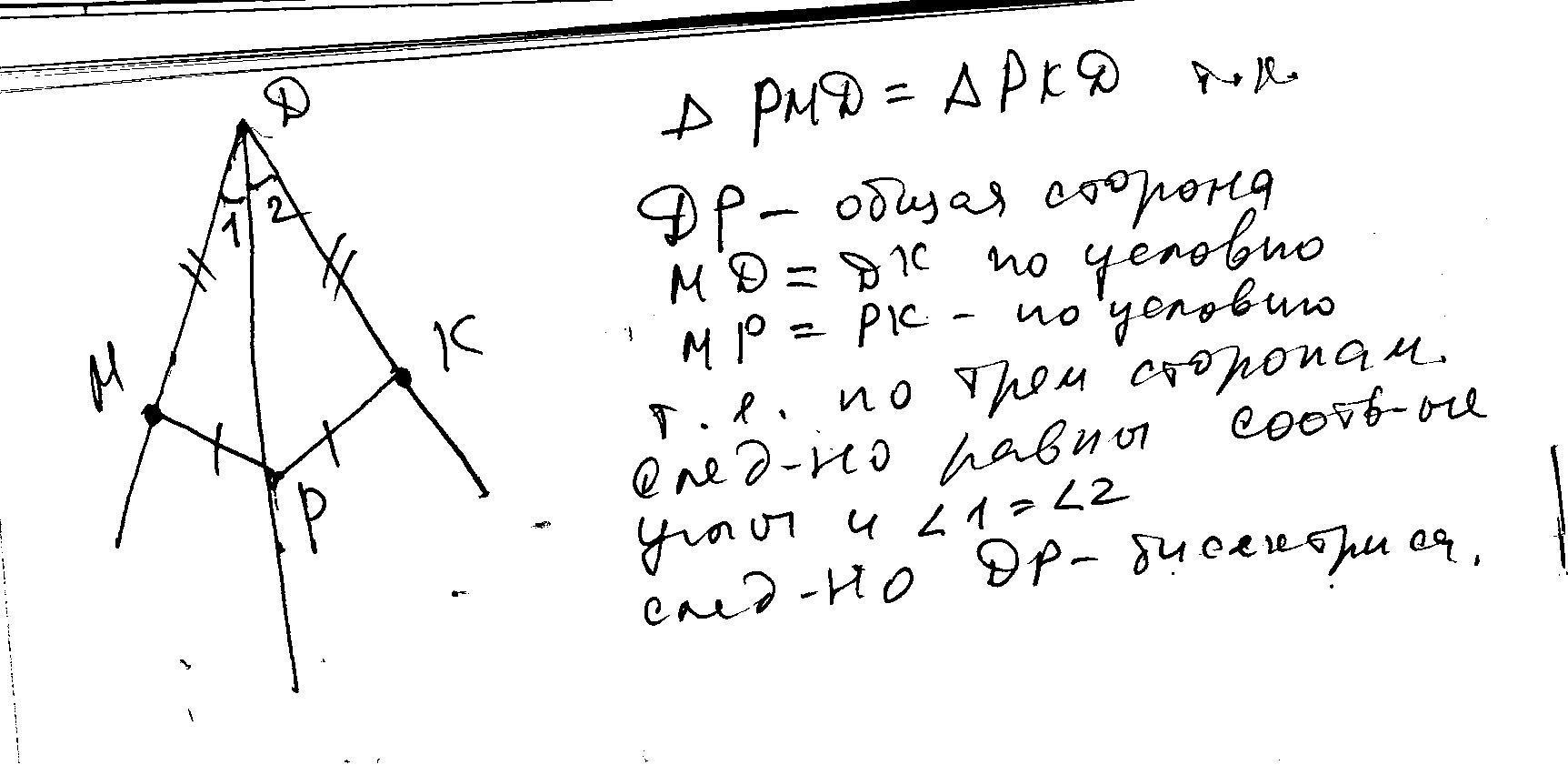 на сторонах угла Д отмечены точки М и К так,что ДМ=ДК точка Р лежит внутри угла Д и РК=РМ .докажите что луч ДР -биссектрис угла МДК.