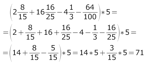 две целых восемь пятнадцатых плюс шестнадцать целых шестнадцать двадцать пятых минус четыре целых одна третья минус ноль целых шестьдесят четыре сотых и все это умножить на 5