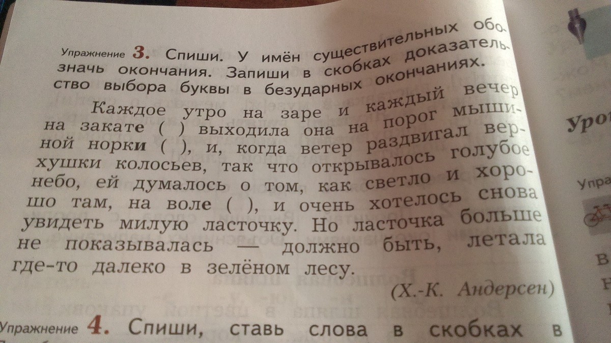 Помагите плиз. Спиши. У имён существительных обозначь окончание. Запиши в скобках доказательство выбора буквы в безударных окончаниях.