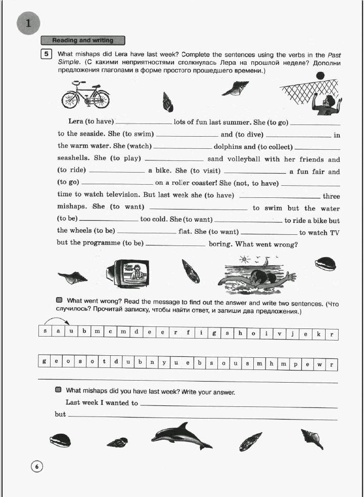 Lera HAD lots of fun last summer. She WENT to the seaside.She SWAM and DIVED in the warm water. She WATCHED dolphins and COLLECTED seashells. She PLAYED sand volleyball with her friends and RODE a bike. She VISITED a fun fair and WENT on a roller coaster! She DIDN'T HAVE time to watch television. But last week she HAD three mishaps. She WANTED to swim but the water WAS to cold. She WANTED to ride a bike but the wheels WERE flat. She WANTED to watch TV but the programme WAS boring. What went wrong?
