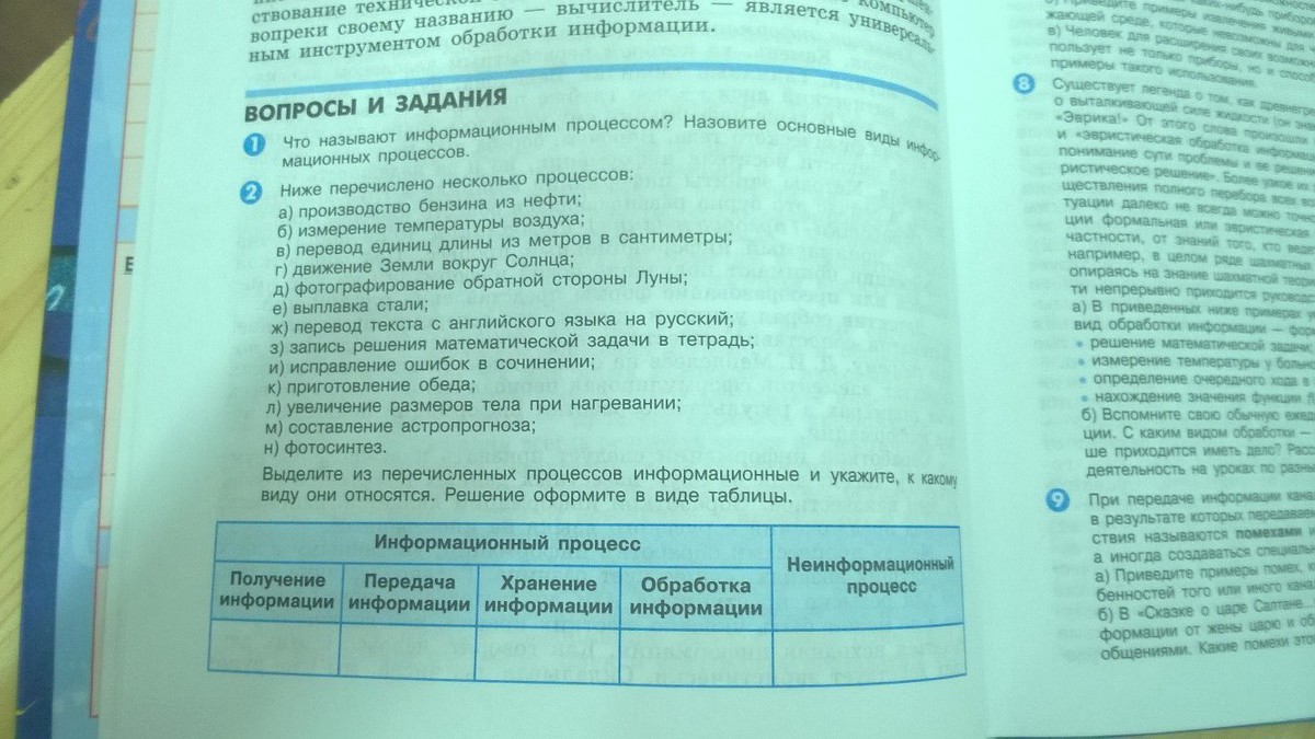 1. Информационным называют процесс, связанный с определёнными операциями (действиями) над информацией, в ходе которых может измениться содержание информации или её форма. Это процессы сбора, обработки, хранения, накопления, передачи/получения информации.