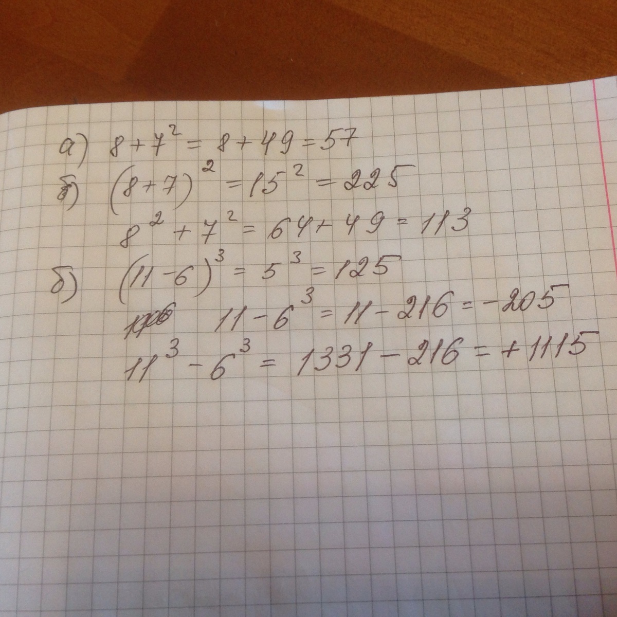 а)8+7 во 2 степени,(8+7)во 2 стпени,8 во 2 степени+7во 2 степени;