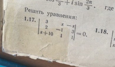 \left|\begin{array}{ccc}3&x&-x\\2&-1&3\\x+10&1&1\end{array}\right| =-3-2x+3x(x+10)-[x(x+10)+9+2x]=\\\\\\=2x^2+16x-12=0\\\\x^2+8x-6=0\\\\D=64+24=88=4\cdot 22\\\\x_1=-4-\sqrt{22}\; ;\; \; x_2=-4+\sqrt{22}