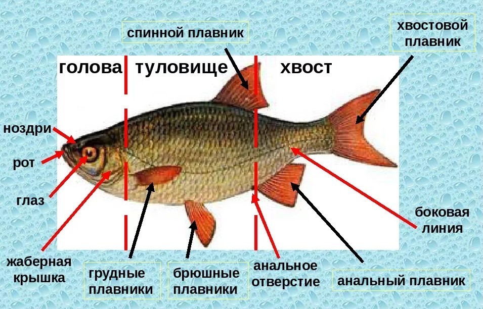 Тело рыбы состоит из плавно переходящих друг в друга головы, туловища и хвоста имеющих форму тела максимально обтекаемую, что необходимо для передвижения в плотной водной среде. Так же рыба имеет чешую уложенную наподобие черепицы и покрытую слизью, что еще больше снижает сопротивление тела рыбы в воде. Глаза рыб лишены век, так как это не требуется они и так постоянно влажные.