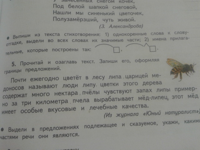 Почти ежегодно цветет(сказуемое,глагол) в лесу липа (подлежащее, существительное). Царицей медоносов называют (сказуемое, глагол) люди (подлежащее, существительное) липу. Цветки (подлежащее, существительное) этого дерева содержат(сказуемое, глагол) много нектара. Пчелы (сущ., подлеж.) чувствуют(глагол, сказуемое) запах липы примерно за три километра. Пчела(подл., существ.) вырабатывает(глагол, сказуемое) мед-липец, этот мед(сущ., подлежащее) имеет(сказуемое, глагол) особые вкусовые и лечебные качества.