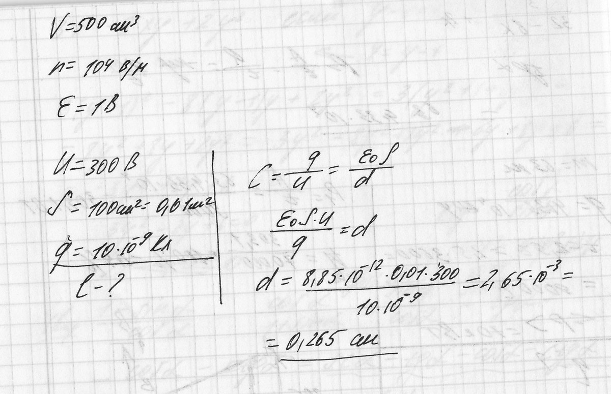 Разность потенциалов на пластинах плоского конденсатора U=300B. Площадь каждой пластины S=100 см2 и заряд Q=10нКл. Определить расстояние между пластинами.