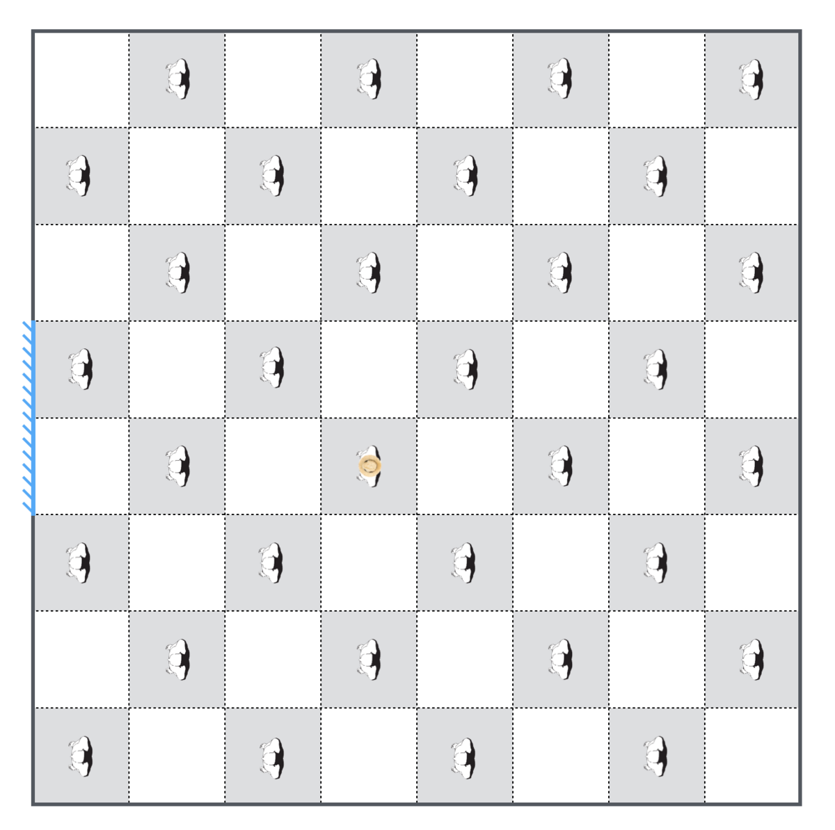 В центре каждой чёрной клетки стоит по танцору, причём на голову одного из них надета шляпа. Сколько танцоров увидят изображение шляпы в зеркале? Каждый человек в зале имеет точечные размеры по сравнению с размерами клетки. Считать, что шляпа и любой танцор в зале не закрывает изображение шляпы в зеркале.