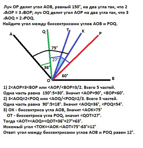 Луч OP делит угол AOB, равный 150°, на два угла так, что 2∠AOP = 3∠BOP; луч OQ делит угол AOP на два угла так, что 3∠AOQ = 2∠POQ. Найдите угол между биссектрисами углов AOB и POQ.