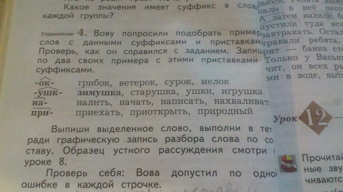 Напишите пожалуйста Вову попросили подобрать примеры слов с данными суффиксами и приставками.Проверь,как он справился с заданием.Запиши по два своих примера с данными