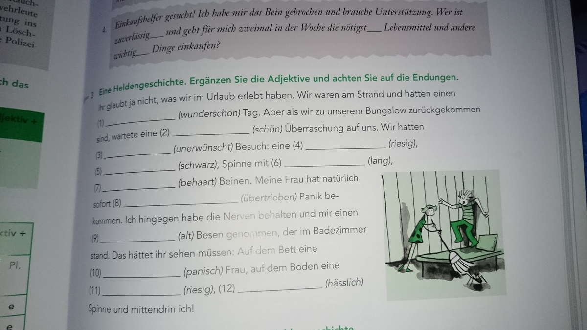 1)wunderschönen 2)schöne 3)unerwünschten 4)riesige 5) schwarze 6)langen 7)behaarten 8)übertriebene 9)alten 10) panische 11)riesige 12)hässliche