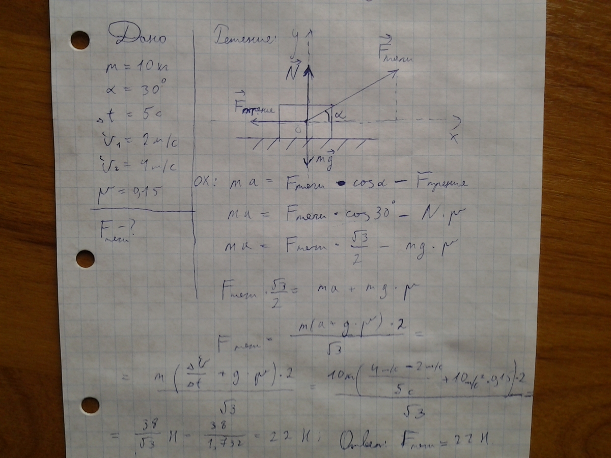 некоторую силу nод углом 30° к горизонту. В течение 5 с скорость