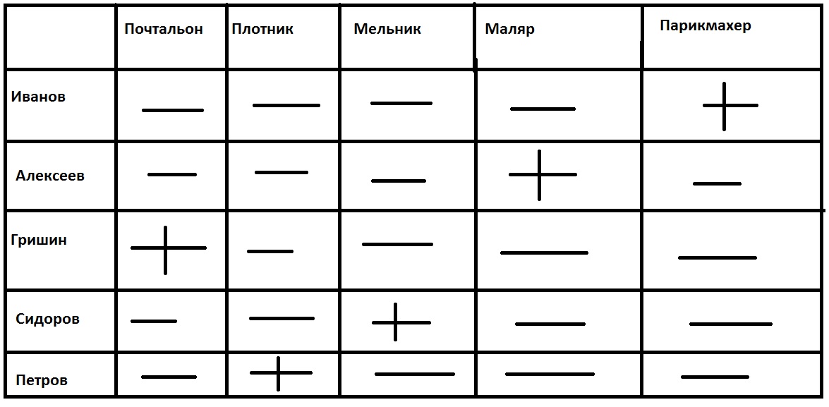 В небольшом городке живут пятеро друзей: Иванов, Петров, Сидоров, Гришин и Алексеев. Профессии у них разные: один -маляр, другой - мельник, третий - плотник ,четвертый - почтальон,пятый - парикмахер. Петров и Гришин никогда не держали в руках малярной кисти.Иванов и Гришин всё собираются посетить мельницу,на которой работает их товарищ. Петров и Иванов живут в одном доме с почтальоном. Иванов и Сидоров каждое воскресенье играют в городки с плотником и маляром. Петров брал билеты на футбол для себя и мельника. Определите профессию каждого из друзей.