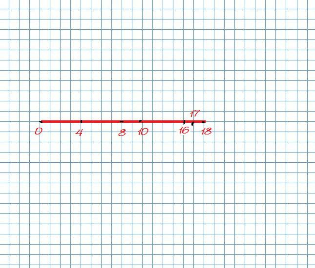 Начертите отрезок длинной 9 см.Над одним концом отрезка напишите число 0, а над другим - 18.Разделите отрезок на 6 равных частей.Назовите числа, которые соответствуют каждому делению.Отметьте на полученной шкале числа 4;8;10;16;17.