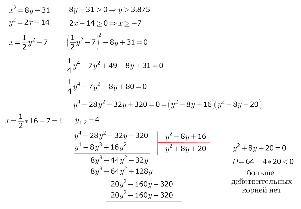 {x² -8y +31 =0 ;y² -2x -14 =0 .⇔{ y =(x²+31)/8 ; ( (x²+31)/8 )² -2x -14 =0,