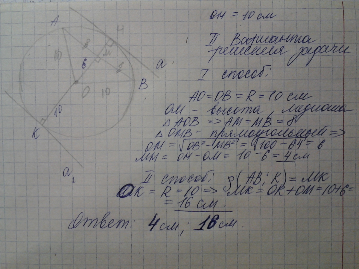 Радиус окружности с центром в точке о равен 10 см длина хорды АВ = 16 см. Найдите расстояние от хорды АВ до параллельных ей касательной А