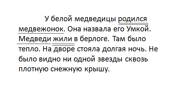 У белой медведицы родился(сказуемое, две черты) медвежонок(подлежащие, одна черта). Она(подлежащие, одна черта) назвала(сказуемое, две черты) его Умкой. Медведи(подлежащие, одна черта) жили(сказуемое, две черты) в берлоге, там было тепло(безличное, три черты). На дворе стояла долгая ночь, не было видно ни одной звезды сквозь плотную снежную крышу.