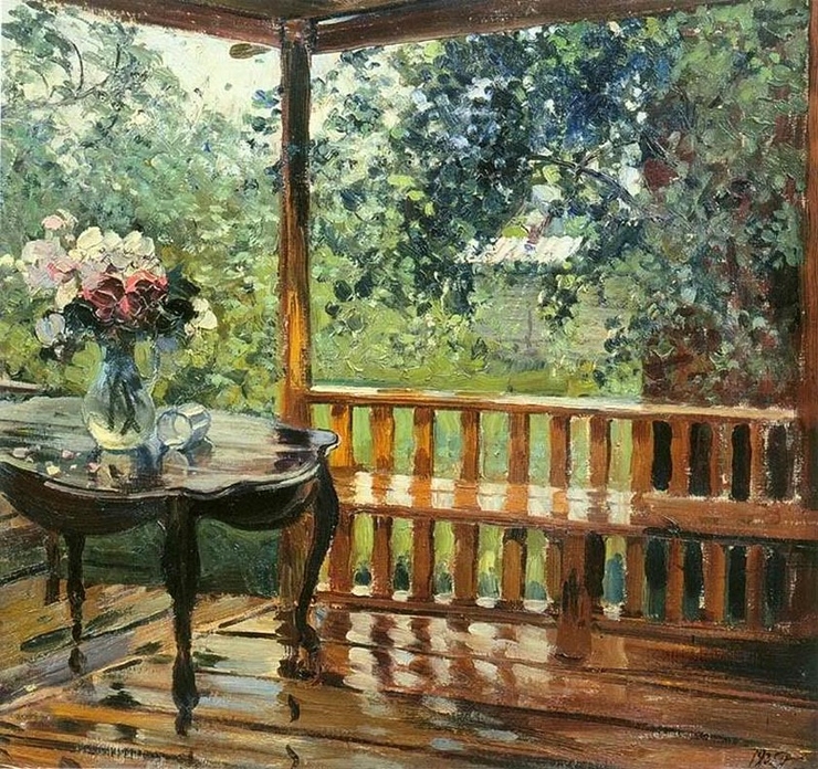 Уже с первых секунд взора на картинку А. Герасимова невольно ощущаешь свежесть только что прошедшего дождя. Автору картины настолько точно удалось передать ту атмосферу, которая царит вокруг и даже в самом воздухе после дождя: Видно, что дождь прошел только что, что даже ни капельки не высохло. А благодаря уже выглянувшему солнцу четко видно как блестит вода. Видно и пробивающиеся лучи солнца в саду. Все поверхности - стол, пол, скамейка, листва, в бликах. И складывается такое ощущение, что если дотронутся рукой до картины , то почувствуешь влажность. Мы видим террасу, на которой возможно совсем недавно сидели хозяева дома, пили чай, читали газету, и внезапно все попрятались из-за начавшегося дождя.