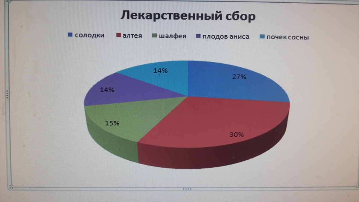 представьте в виде круговой диаграммы состав лекарственного сбора: корень солодки - 27%; корень алтея - 29,8%; листьев шалфея - 14,4%; плодов аниса - 14,4%; почек сосны - 14,4%. СРОЧНО НАДО. заранее спасибо