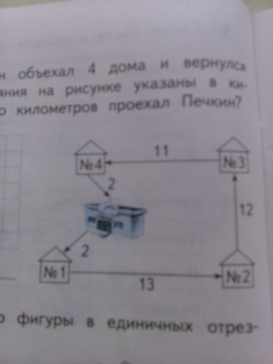 Почтальон Печкин объехал 4 дома и вернулся на почту. Расстояние на рисунке указаны в километрах. Сколько километров проехал Печкин?