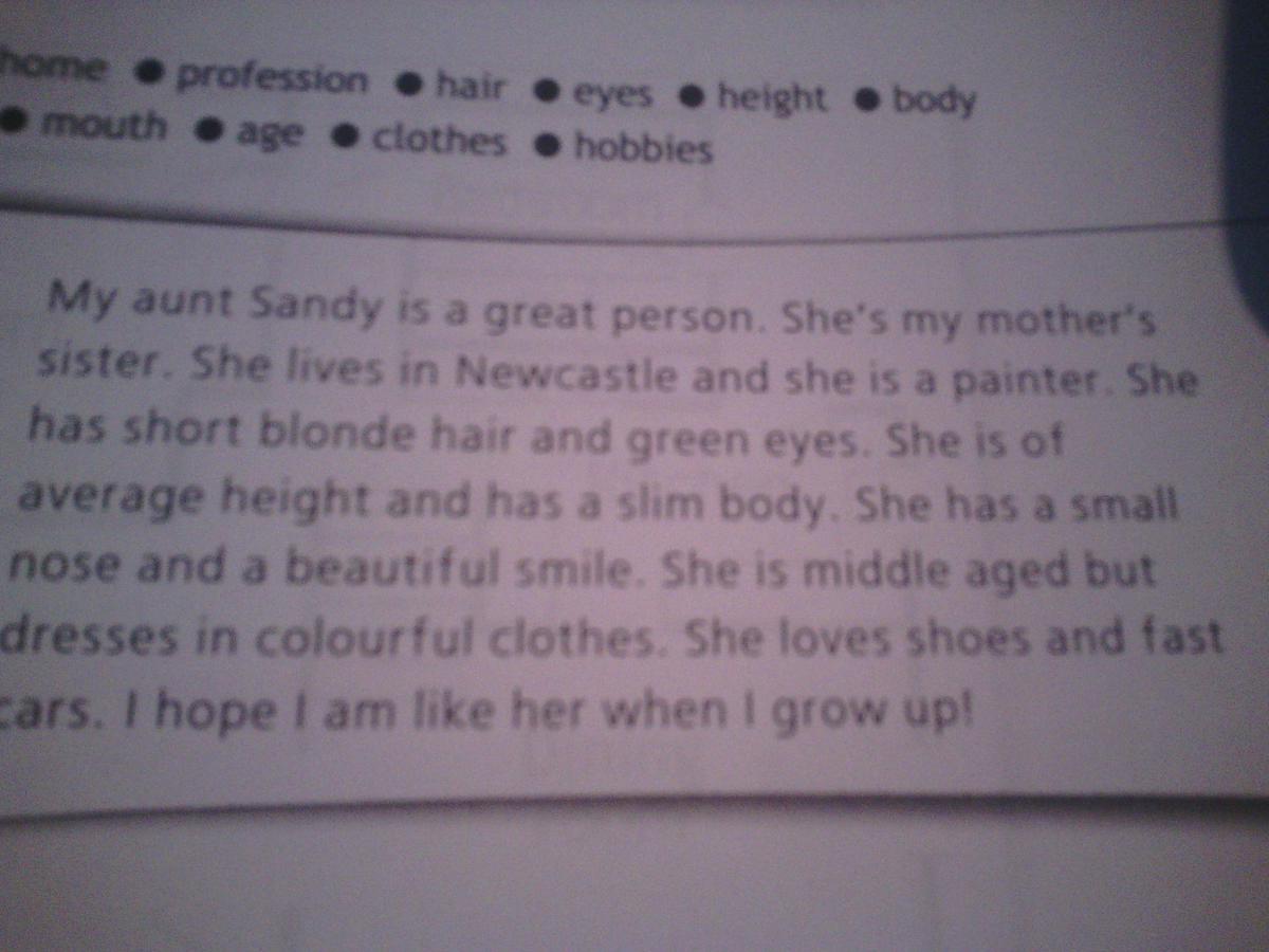 Моя тетя Сэнди прекрасный человек. Она сестра моей мамы. Живет она в НьюКастл и она художник. У нее короткие блондинистые волосы и зеленые глаза. Она среднего роста и имеет худое тело. У нее маленький нос и красивая улыбка. Она среднего возраста и носит разноцветные вещи. Она любит туфли и быстрые машины. Я надеюсь,что буду похож на нее, когда вырасту!
