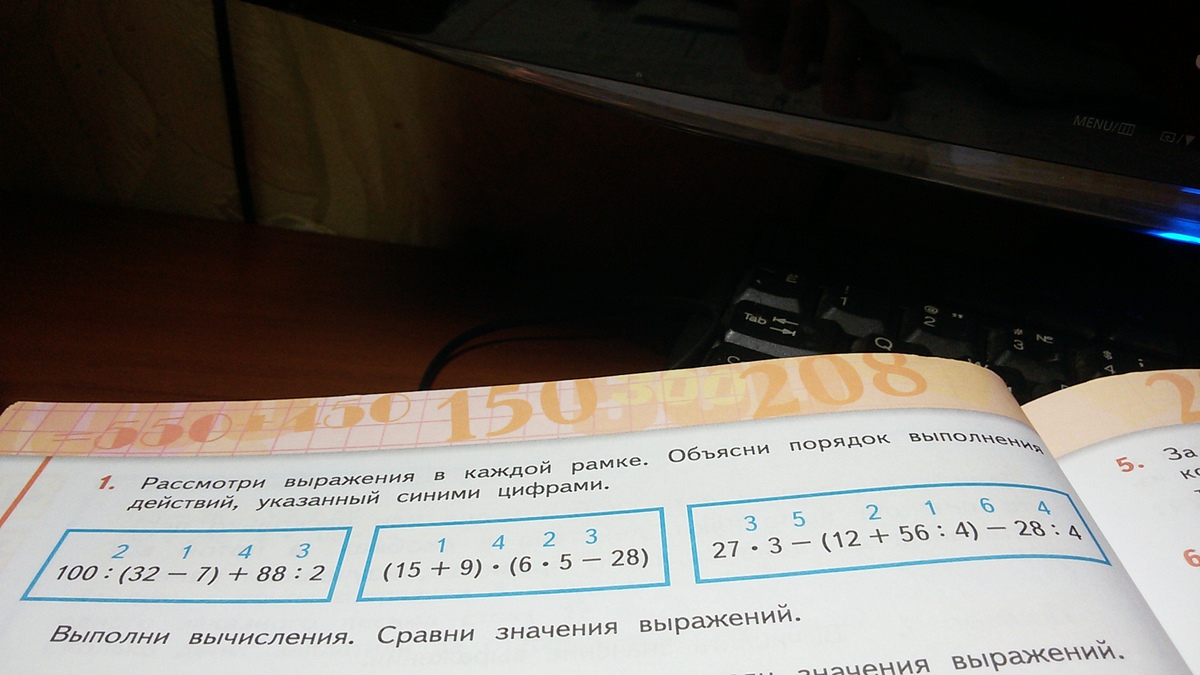 Помогите всё на фото Рассмотри выражения в каждой рамке Обьясни порядок выполнения действий указанный синими цифрами.