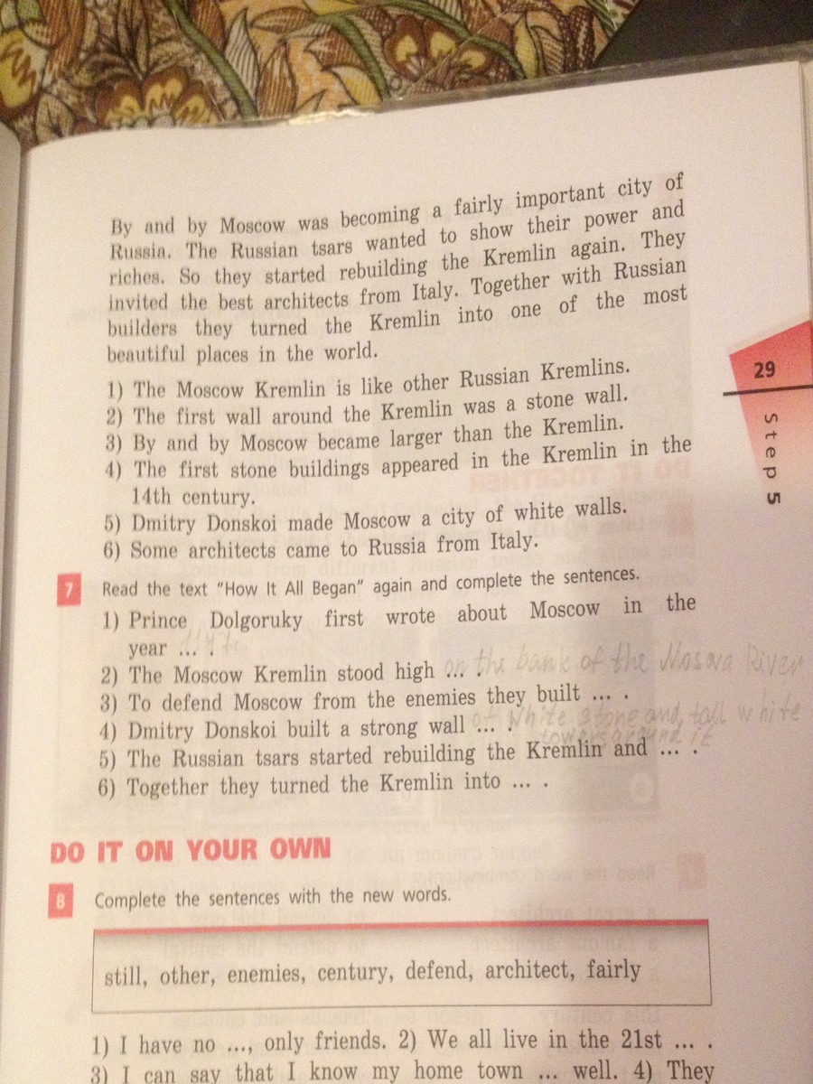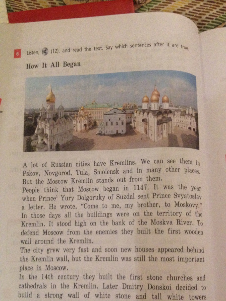Во Многих русских городах есть Кремль. Мы можем увидеть его в Пскове, Новгороде, Туле, Смоленске и во многих других местах, но Московский Кремль выделяется среди всех. Люди считают , что Москвы была основана в 1147 год. В год, когда князь Юрий Долгорукий Суздальский написал князю Святославу письмо. Он написал, Иди ко мне, мой брат, в Москву. В те времена на территории Кремля были одни только постройки. Он стоял на высоком берегу Москвы-реки. Для Защиты Москвы от врагов они построили первую деревянную стену вокруг Кремля . Город рос очень быстро и скоро новые дома появились за стены Кремля, но Кремль по-прежнему занимает важное место в Москве. В 14 веке они построили первые каменные церкви и соборы в Кремле. Позже Дмитрий Донской решил построить крепкие стены из белого камня и высокие белые башни