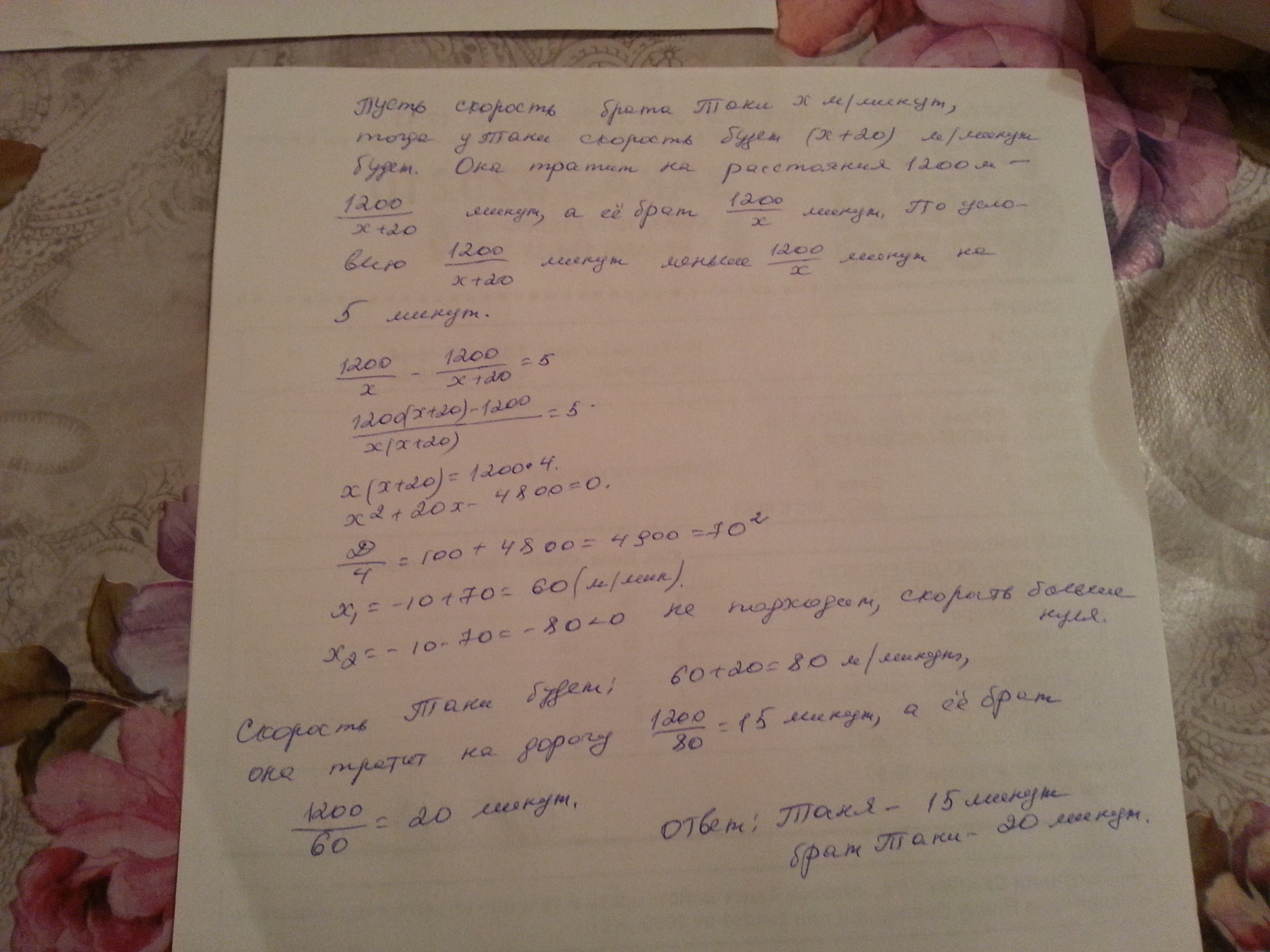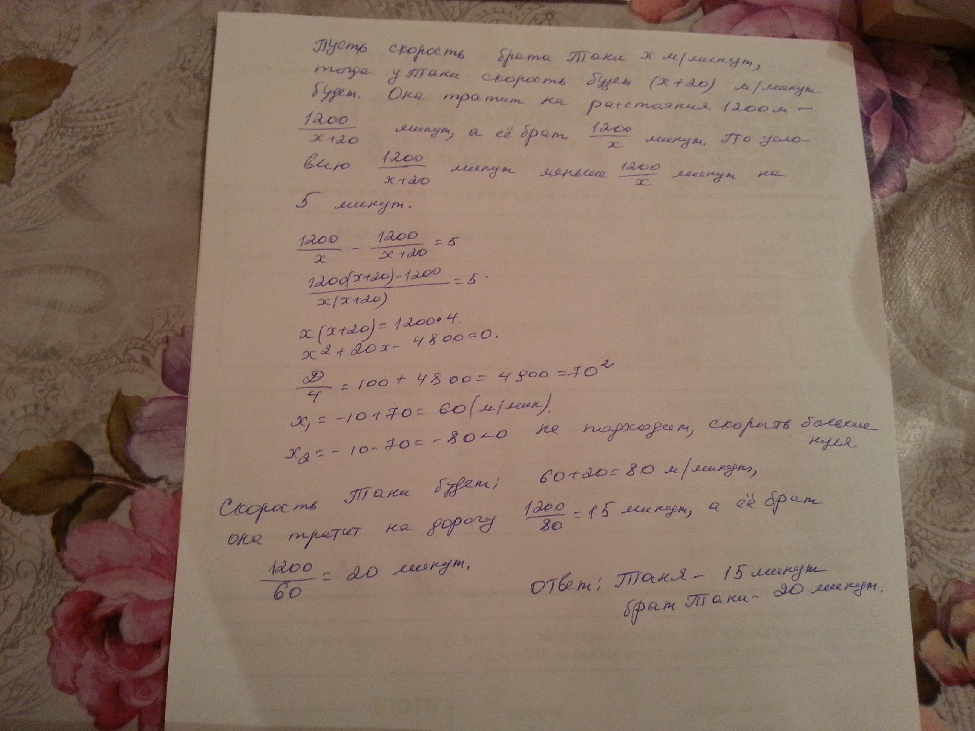 РАсстояние от дома до школы ровно 1200м. Таня проходит это расстояние на 5 мин быстрее, чем её младший брат, так как её скорость на 20 м/мин больше скорости брата. СКОЛЬКО МИНУТ ИДЁТ ОТ ДОМА ДО ШКОЛЫ ТАНЯ И СКОЛЬКО ЕЁ БРАТ?