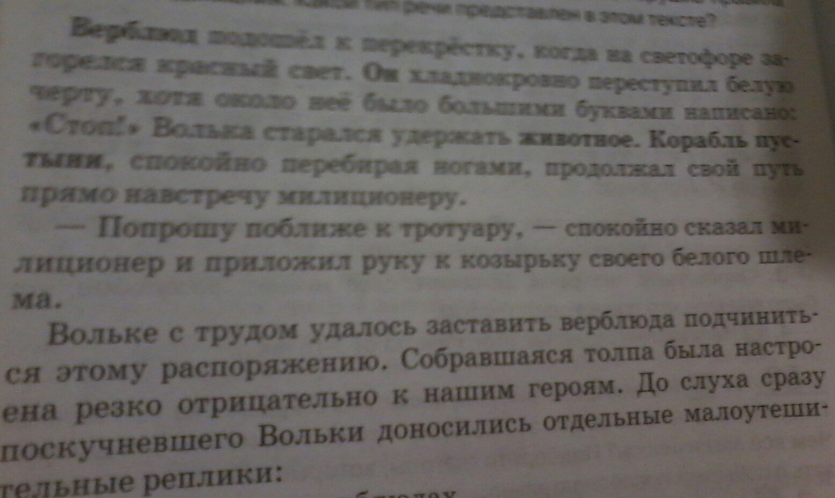 Красный свет,подошёл к перекрёстку,переступил хладнокровно,белую черту,большими буквами,написано буквами,удержать животное,корабль пустыни,перебирал ногами,свой путь,продолжал путь,навстречу милиционеру,поближе к тротуару,белого шлема,сказал спокойно,приложил руку,приложил к козырьку,своего шлема,удалось с трудом,заставить верблюда,подчиниться распоряжению,этому распоряжению,собравшаяся толпа,настроена резко,настроена отрицательно,нашим героям,поскучневшего Вольки.