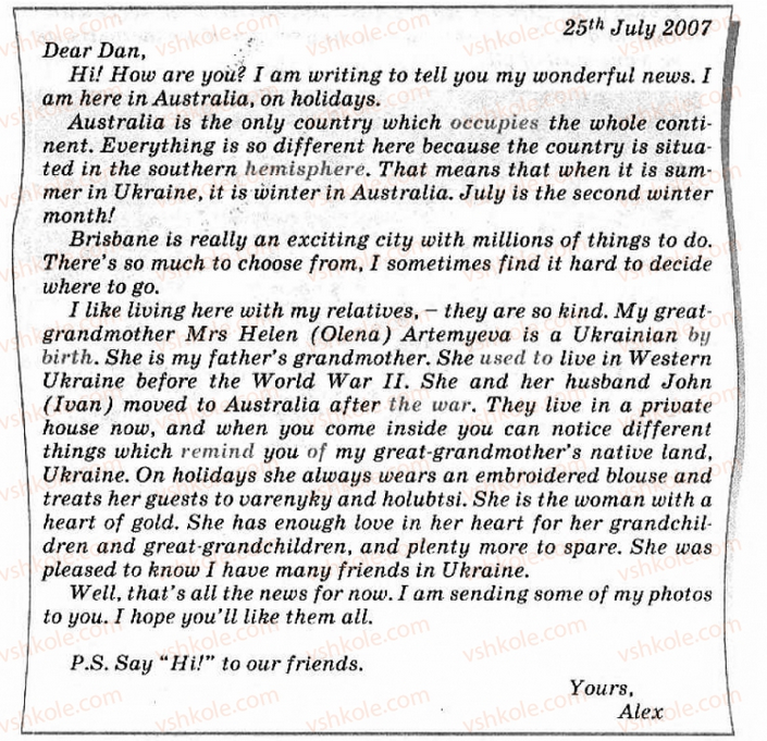Мне нравится жить здесь с моими родственниками - они такИе добрые. моя бабушка мисис Хелен (Алена) Артемьева украинка от рождения.Она бабушка моего папы. она жила в восточной Украине до Второй Мировой войны. она и ее муж Джон (Иван) переехали в Австралию после войны. сейчас они живут в личном доме и когда ты входишь внутрь,ты можешь заметить разные вещи, которые напоминают тебе о родной земле моей пробабушки - Украине.в каникулы она всегда носит вышитую кофту и радует ее гостей варениками и голубцами. она женщина с золотым сердцем. у нее достаточно любви в ее сердце для ее внуков и правнуков и намного больше в запасе. она была рада узнать что у меня много друзей в Украине.