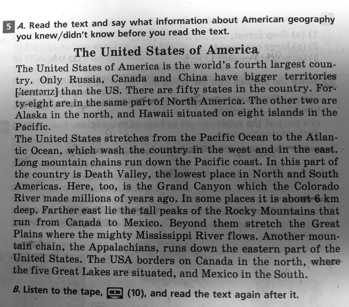 Long mountain chains run down the Pacific coast. There is Death Valey and the Grand Canyon in this part of the country. Farther east lie the Rocky Mountains and the Great Plains where the mighty Mississippi River flows. The Appalachians runs down the eastern part of the United States.