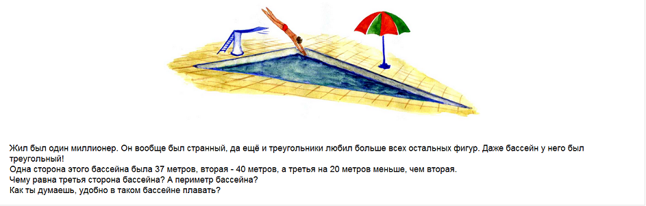 1.Перечислите правила экологической безопасности. 2.Задача: Жил был один миллионер. Он вообще был странный, да ещё и треугольники любил больше всех остальных фигур. Даже бассейн у него был треугольный! Одна сторона этого бассейна была 37 метров, вторая - 40 метров, а третья на 20 метров меньше, чем вторая. Чему равна третья сторона бассейна? А периметр бассейна? Как ты думаешь, удобно в таком бассейне плавать? К ЗАДАЧЕ РЕШЕНИЕ И ОТВЕТ!