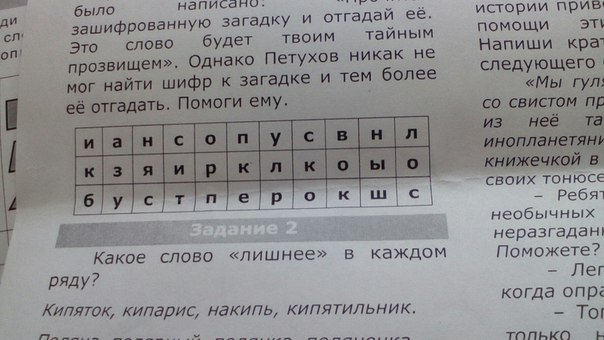 Сегодня разведчик Петухов получил странное письмо. Вот что там было написано : "Прочитай зашифрованную загадку и отгадай ее. Это слово будет твоим прозвищем." Однако Петухов никак не мог найти шифр к загадке и тем более ее отгадать.Помоги ему.